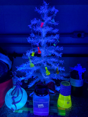 A Coluna "Sarau SBQ" quer divulgar e promover manifestações artÃsticas da nossa comunidade. Quer divulgar sua arte, relacionada à temática da QuÃmica/Ciência/Laboratório/SBQ? Pode ser desenhos, pinturas, músicas, caricaturas, poesias, crônicas, entre outros. Envie sua arte para elisaorth@gmail.com. Nessa edição temos uma árvore de natal fluorescente enviada pelo Prof. José Barros da UFRJ. Ele montou a árvore com frascos contendo fluoresceÃna, suplemento de vitamina B2 (ribloflavina), rodamina B, água tônica e nitrato de uranila. Mas sugerem também como fazer em casa.