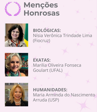 A 7ª edição do Prêmio Carolina Bori Ciência & Mulher também concedeu três menções honrosas. Na categoria Humanidades, o destaque foi para Maria Arminda do Nascimento Arruda, professora da Universidade de São Paulo; já no campo de Exatas e Ciências da Terra, o reconhecimento foi dedicado à Marilia Oliveira Fonseca Goulart, docente da Universidade Federal de Alagoas (UFAL); na área de Ciências Biológicas e da Saúde, a menção honrosa foi para Nísia Verônica Trindade Lima, professora da Fundação Oswaldo Cruz (Fiocruz). » Veja mais...
