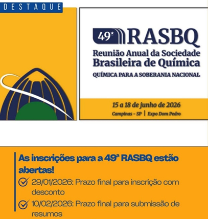 A 49ª RASBQ será em Campinas de 15 a 18 de junho de 2026 e já conta com uma rica programação com mais de 70 palestrantes confirmados. Confira em https://www.sbq.org.br/49ra/. O prazo para pagamento com desconto é 29 de janeiro de 2026 e o prazo para envio de resumo é 10 de fevereiro de 2026. Nessa edição temos algumas novidades, como campanha “Minha primeira anuidade SBQ” para estudante de IC e mestrando, novo sistema online de submissão de resumo, etc. » Veja mais...