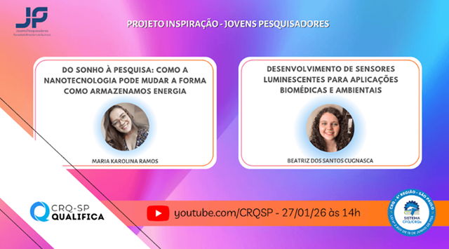 O episódio de janeiro, o primeiro de 2026, foi transmitido no dia 27/01/2026 e contou, inicialmente, com a pós-doutoranda Beatriz dos Santos Cugnasca, do Instituto de Química da Universidade de São Paulo (IQ-USP) e membro do comitê JP-SBQ, que abordou o uso de sensores luminescentes para aplicações biomédicas e ambientais. Ainda na fronteira entre as ciências básica e aplicada, a também pós-doutoranda Maria Karolina Ramos da Universidade Federal do Paraná (UFPR) apresentou as potencialidades do uso de baterias ecológicas a base de sódio, destacando pontos como segurança, flexibilidade e potencialidades desses materiais; além de dar enfoque à transição para uma matriz energética mais sustentável. » Veja mais...