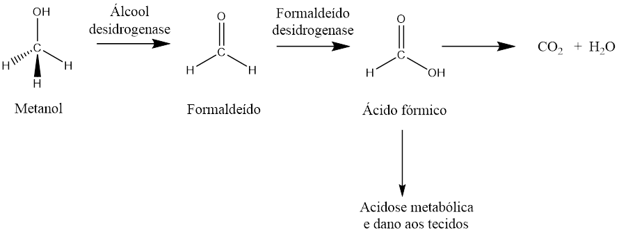 Mas como o metanol é tão tóxico? No corpo humano, o metanol é transformado (metabolizado), por uma enzima chamada álcool desidrogenase, em formaldeído. Essa transformação é relativamente lenta e ocorre principalmente no fígado (embora já comece na mucosa gástrica). Como o processo é lento, um período de latência, com poucos sintomas de intoxicação, pode durar de 12-24 horas. Uma vez formado, o formaldeído é transformado muito rapidamente, por uma enzima chamada aldeído desidrogenase, em ácido fórmico. O ácido fórmico é que é extremamente tóxico para o organismo humano. Em pH fisiológico, ele se dissocia em formiato, que é então transformado em gás carbônico e água, mas esse processo é muito lento, fazendo com que a sua eliminação do organismo seja vagarosa. Em suma, essa combinação de processos lento, rápido, lento, faz com que o ácido fórmico se acumule no organismo e cause todos os problemas observados no envenenamento por metanol (acidose metabólica, lesão do nervo óptico, danos no sistema nervoso central, dentre outros), por diferentes mecanismos.