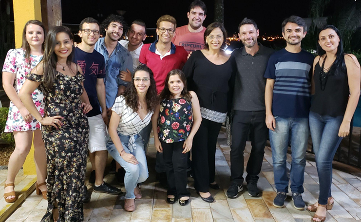 Professora Regina Frem (de preto, de óculos) com seus "mofiosos": "Todo o reconhecimento à minha carreira vem ocorrendo depois do desenvolvimento das pesquisas realizadas em nosso laboratório sobre as MOFs. É por essa razão que nunca devemos desistir dos nossos sonhos"