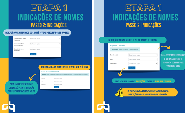 | | ATENÇÃO, as indicações este ano podem ser feitas por partes: primeiramente cargos de diretoria, em seguida conselho consultivo e fiscal, e jovens pesquisadores. Em seguida divisões científicas e depois secretarias regionais.