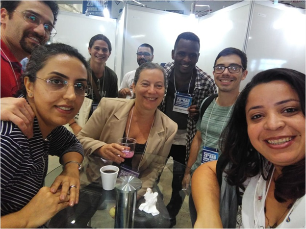 Profa. Maria Luiza Rocco (UFRJ) ao centro, com seus alunos: Temática congrega contribuições de diferentes áreas da química, demonstrando avanços concretos no desenvolvimento de materiais para mitigação das mudanças climáticas