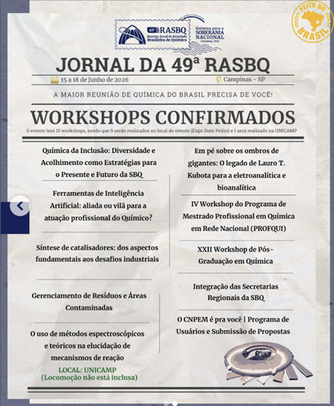 - Pessoas não inscritas na 49ª RASBQ devem pagar R$160,00 que dá acesso apenas ao workshop no dia 15/06/2026 (exceto os workshop no CNPEM, que devem estar inscritos na RASBQ). Não inclui entrada na abertura.
